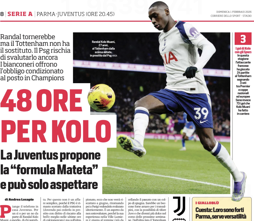 Tottenham’s Randal Kolo Muani finds himself on the front page of Sunday’s Corriere dello Sport. Inside the newspaper the Spurs player is also prominent, as Juventus try to secure him before the deadline.