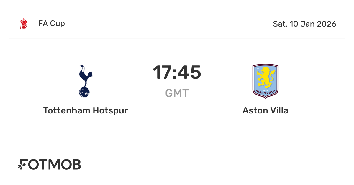 Tottenham Hotspur faces Aston Villa at Tottenham Hotspur Stadium on Sat, Jan 10, 2026, 17:45 UTC . This match is part of the FA Cup. You can check the recent head-to-head encounters, as well as full H2H record on this page to see how Tottenham Hotspur and Aston Villa have fared against each other in the past. On FotMob, you can follow the Tottenham Hotspur vs Aston Villa live score with a full set of match features, including: