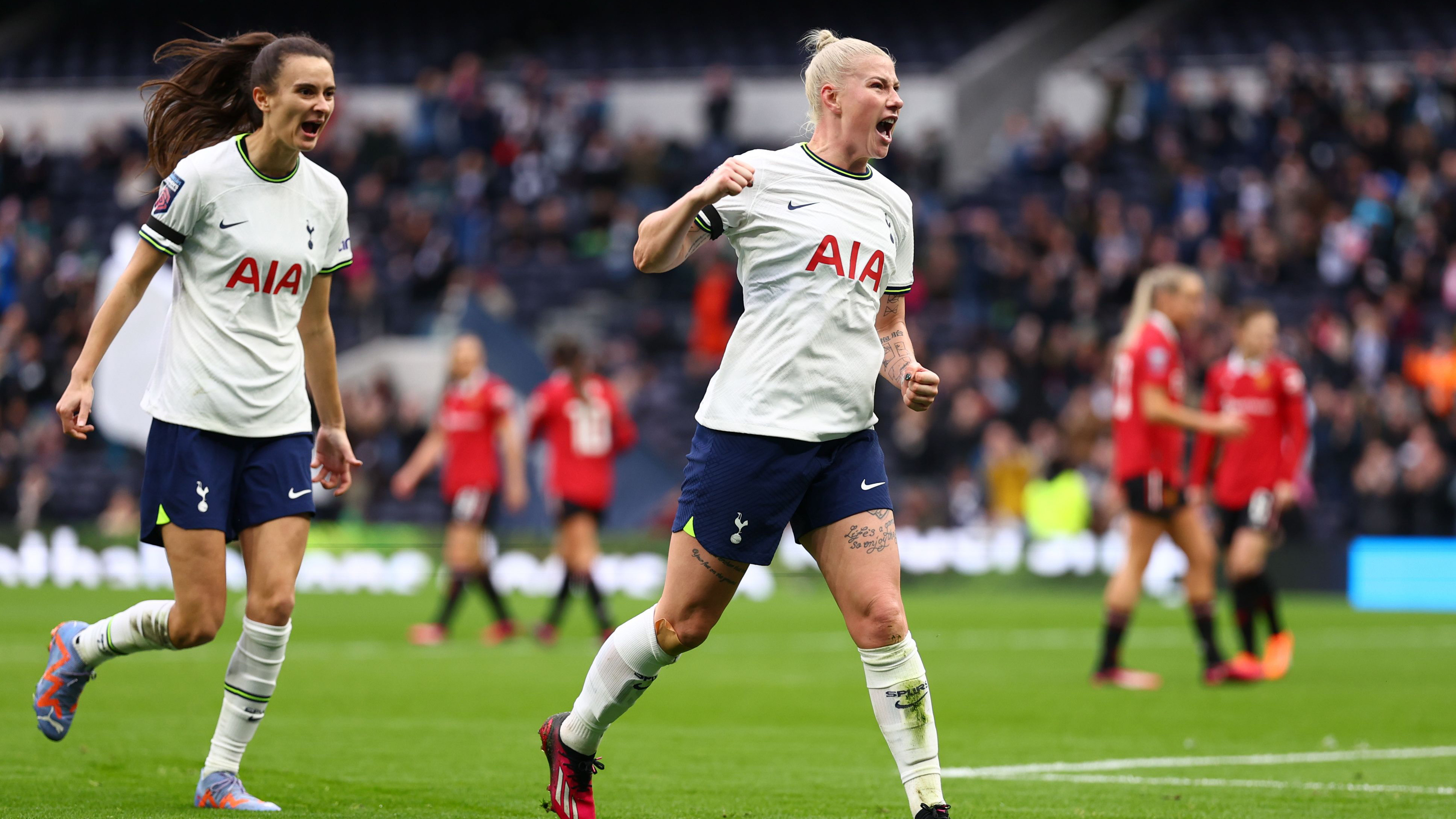 Bethany England leads the way for the most goals scored by a Women’s player at Tottenham Hotspur Stadium, netting six in total, but arguably the most impressive one came against United in their first trip to N17. Having fallen behind after Leah Galton handed the visitors the lead, our captain responded in emphatic fashion to grab an equaliser out of nowhere. Cutting in from the left-hand side, Bethany curled low into the far bottom corner and out of reach from Mary Earps, completing the move with a knee slide in front of a packed crowd. Unfortunately we were unable to hold on to the equaliser, with United regaining the lead before going on to secure the win.
